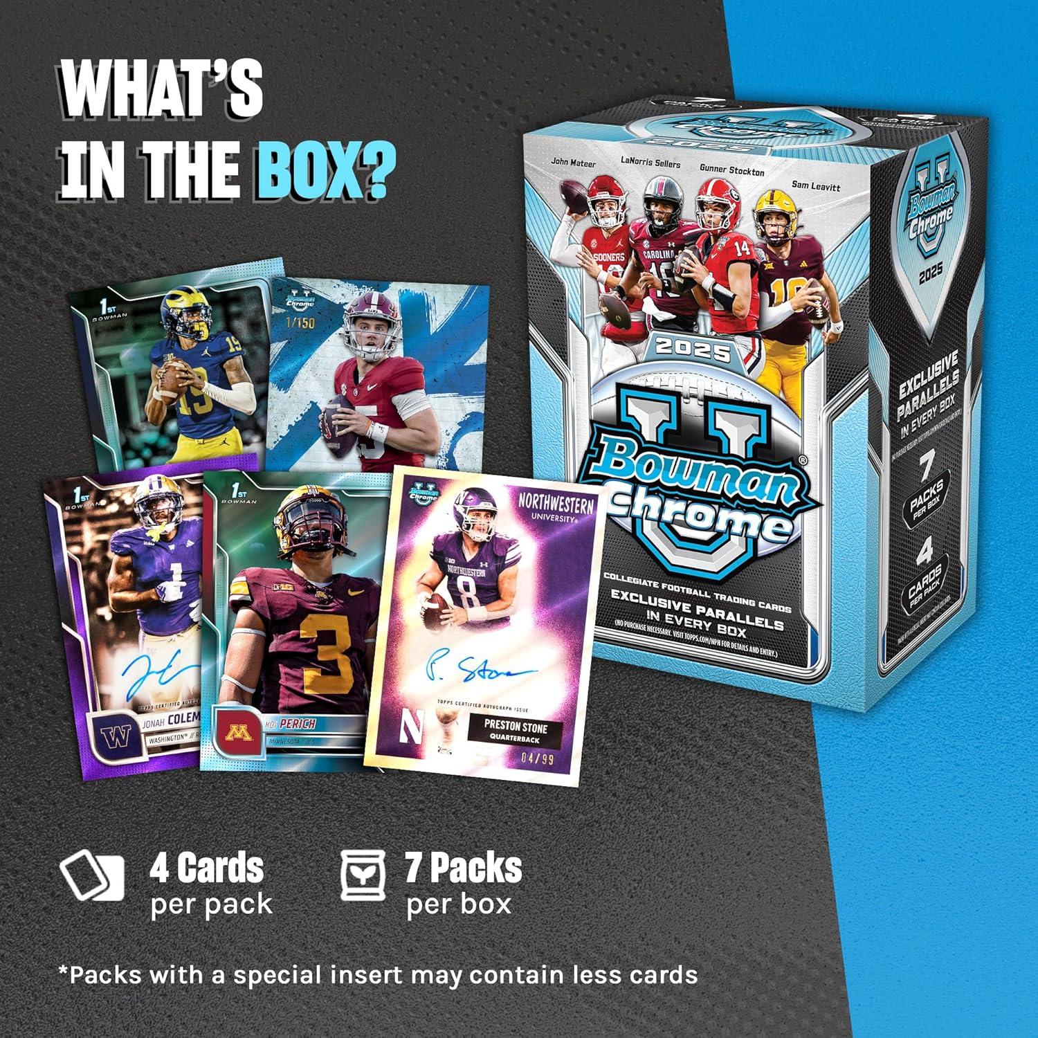 2025 Bowman U Chrome Football brings campus energy to the hobby with chromium shine and a college football trading cards experience. Built for newcomers and veterans alike, it’s a welcoming way to enjoy 2025 football cards in a compact format. Prospecting starts with a deep 200-card base set featuring first appearances and emerging names across powerhouse programs. Build out the first Bowman football cards of rising talents like Aidan Chiles (Michigan State), Rocco Becht (Iowa State), and Koi Perich (Minnesota). Every pull feels like a step in the journey from university fields to the next level. The insert lineup blends heritage with fresh concepts. New for 2025, College Rule Playbook and Lettered Up! sit alongside returning favorites 1955 Bowman Football, Path to Glory, and Acropolis—a mix that rewards set builders and storytellers alike. Short-print content raises the stakes with the 1955 All-American Variations (new), the Physical Education insert exclusive to Value and Mega configurations, and Bowman Chrome Prospect Image Variations for added discovery of rare football cards. Select boxes may include autographed football cards, headlined by new Campus Star Signatures, Campus Visit Autographs, and 1955 All-American Autograph Variations, plus returning Bowman Chrome Prospect and Acropolis autos. Signers span the college landscape, including names like Whit Weeks (LSU) and KC Concepcion (Texas A&M) that complement your Bowman U collection. Mascot signers also join the season’s narrative with school icons represented across Chrome variations. From first looks at tomorrow’s stars to inserts and autographs, 2025 Bowman U Chrome Football balances tradition and innovation for a truly collectible football card experience.