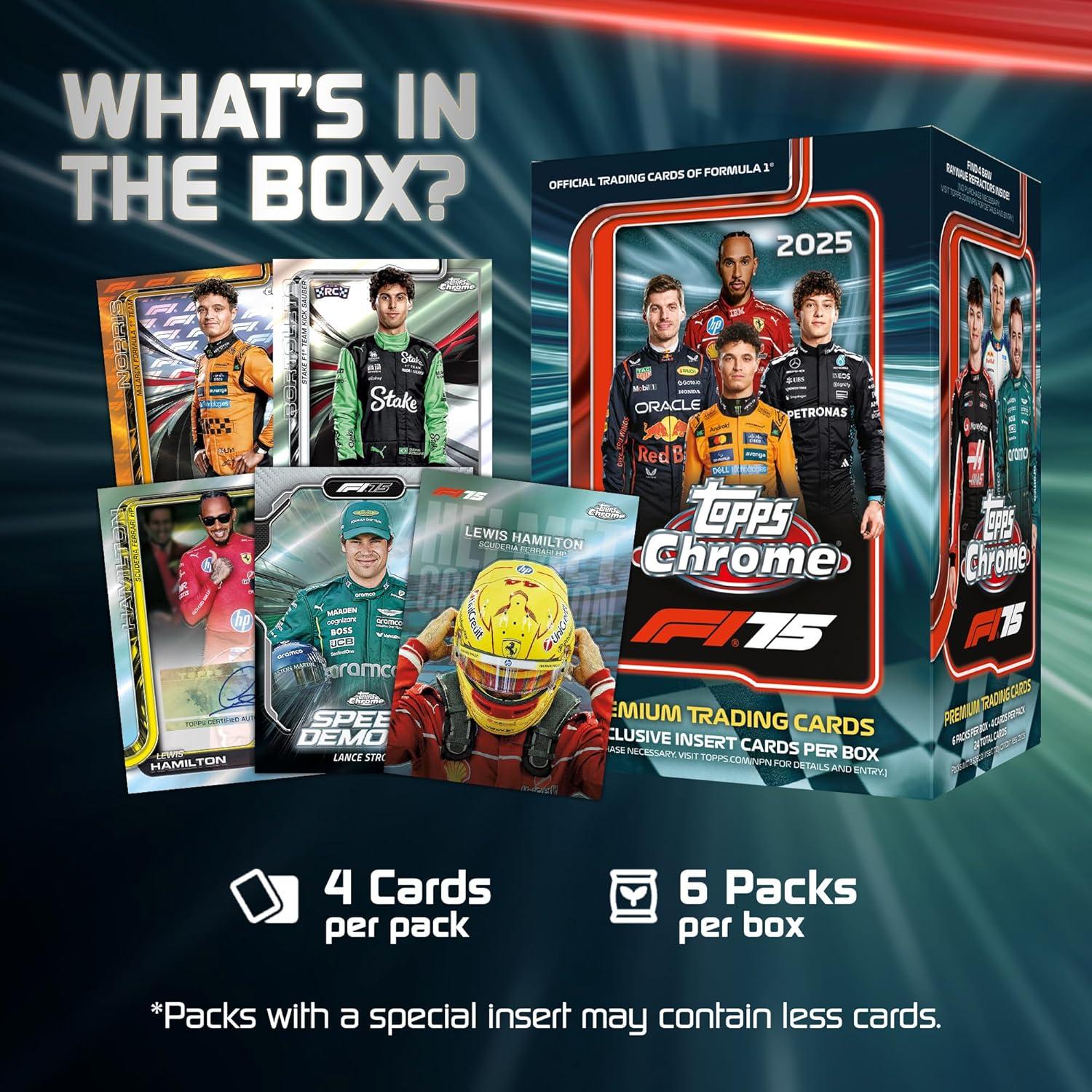 Inserts That Change the Look: Fan favorites Helmet Collection, Speed Demons, and Futuro return alongside new 1975 Speed Wheels, Ace of Trades, Floor It, F1 Chrome Diamond Drives, The Chain, and Neon Nations. Value Box only Top Speed and Four and More join limited F175 Anniversary Logo and Helix, adding collectible F1 cards and rare F1 cards to this release.