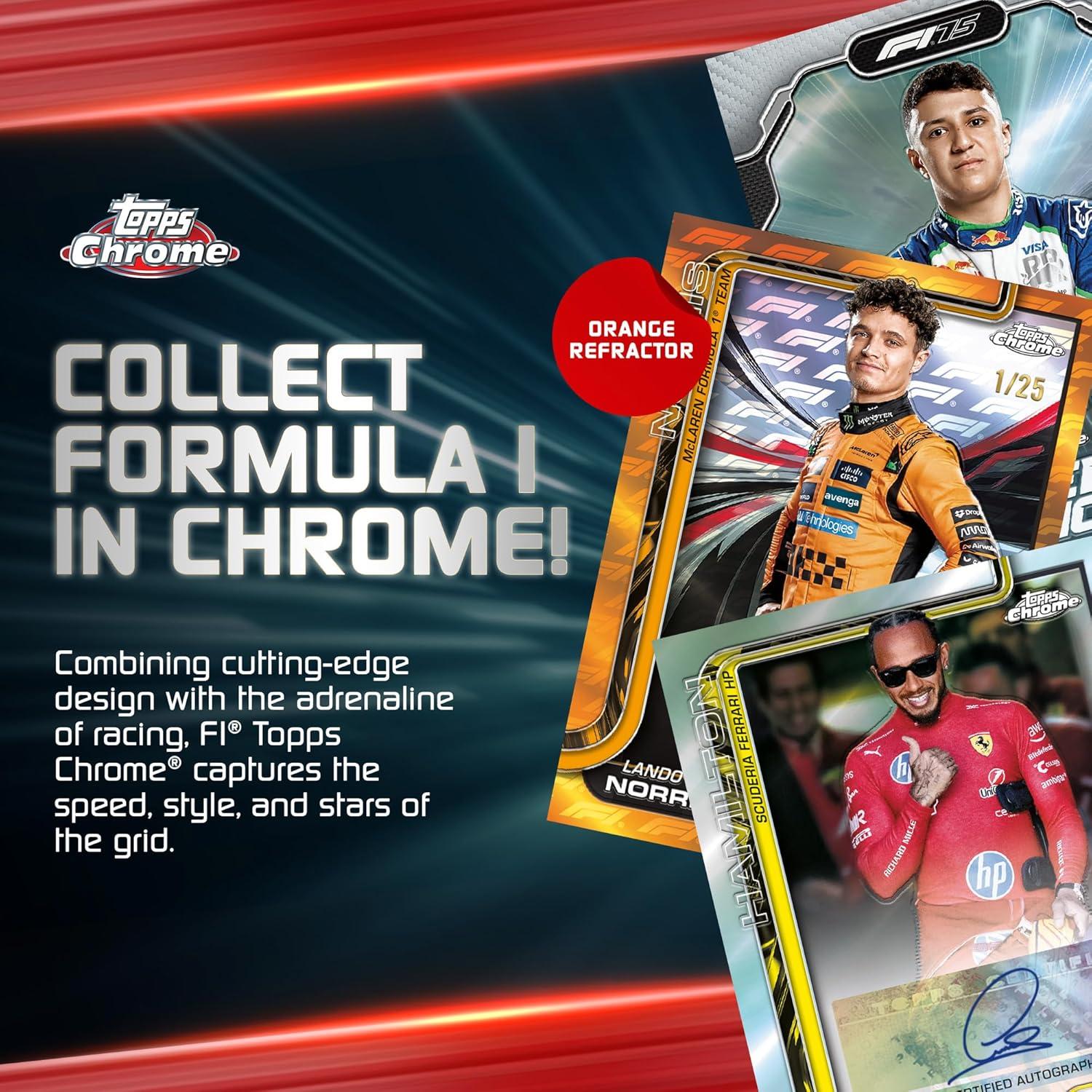 From Lights Out to the Final Lap: 2025 Topps Chrome Formula 1 brings Chrome shine to race day, with a 200-card base set spanning F1, F2, and F3 drivers, cars, duo cards, and team logos from Ferrari, McLaren, Mercedes, Red Bull Racing, and Aston Martin. Collect Formula 1 cards featuring more autographs than ever and the most rookies in Topps F1 history, with Lewis Hamilton, Max Verstappen, and Fernando Alonso among the stars.