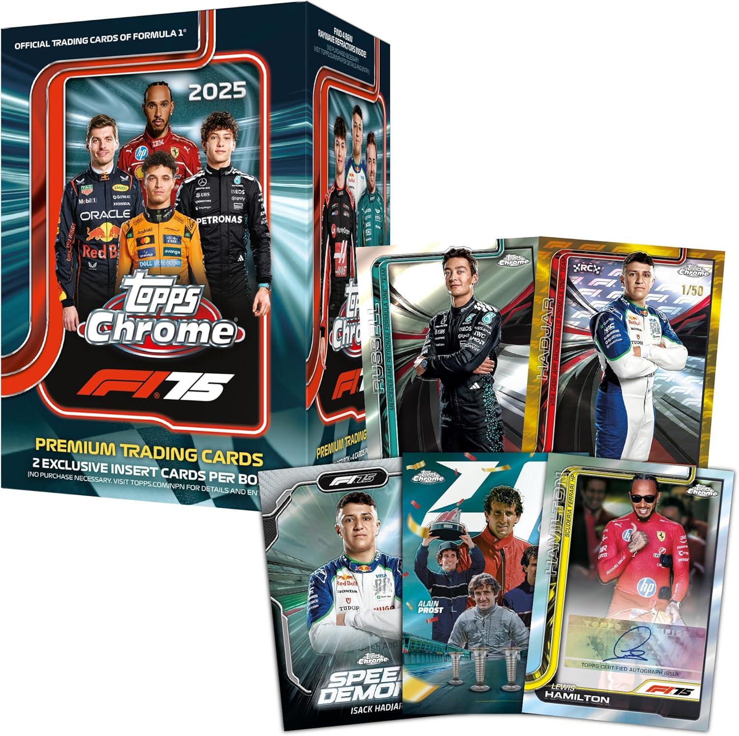 Let’s go racing! The 2025 Topps Chrome Formula 1 collection has arrived, featuring more F1 autographs than ever before and the most rookies in Topps F1 history. Collect the full 200-card Base Set showcasing F1, F2 and F3 drivers, F1 cars, F1 duo cards, team logo cards, and including more legends than any other collection! This year’s release brings back fan-favourite inserts like Helmet Collection, Speed Demons, and Futuro, alongside exciting new designs debuting for the first time: 1975 Speed Wheels, Ace of Trades, The Chain and Helix. Chase the exclusive F175 Refractor Foil — limited to just /75! Race to the finish and complete your collection!