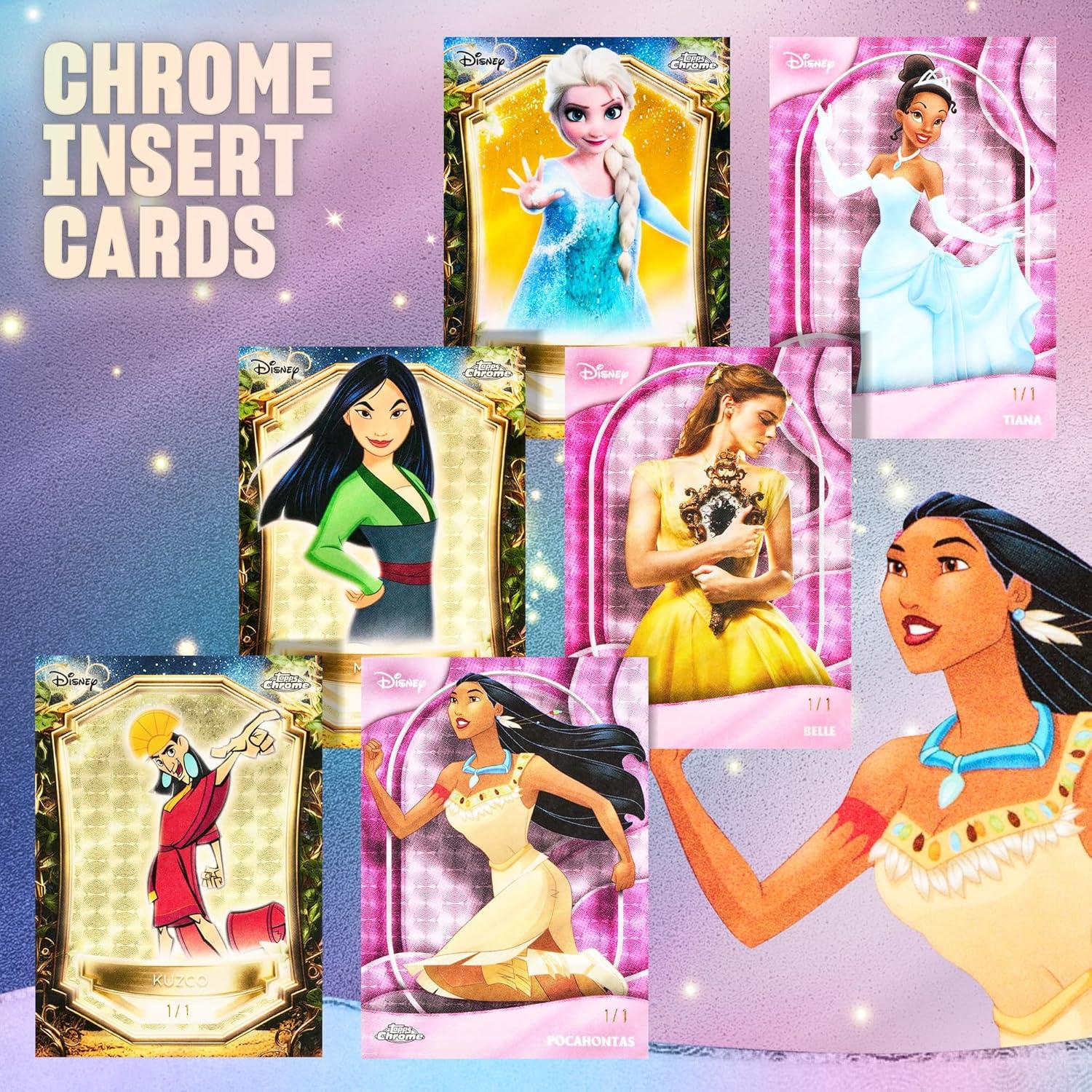 Chrome Insert Cards: Collect Topps Chrome Disney inserts that spotlight Disney storytelling. This insert lineup includes Wish Upon a Star Die-Cut, Topps Enchantments, and SHINY inspired by Tamatoa from Moana. Celebrate exclusive cards like Cinderella Glass Slipper Chrome numbered to 75 and the true 1 of 1 PrincessFractor, showcasing Disney Princesses such as Tiana, Snow White, and Rapunzel.