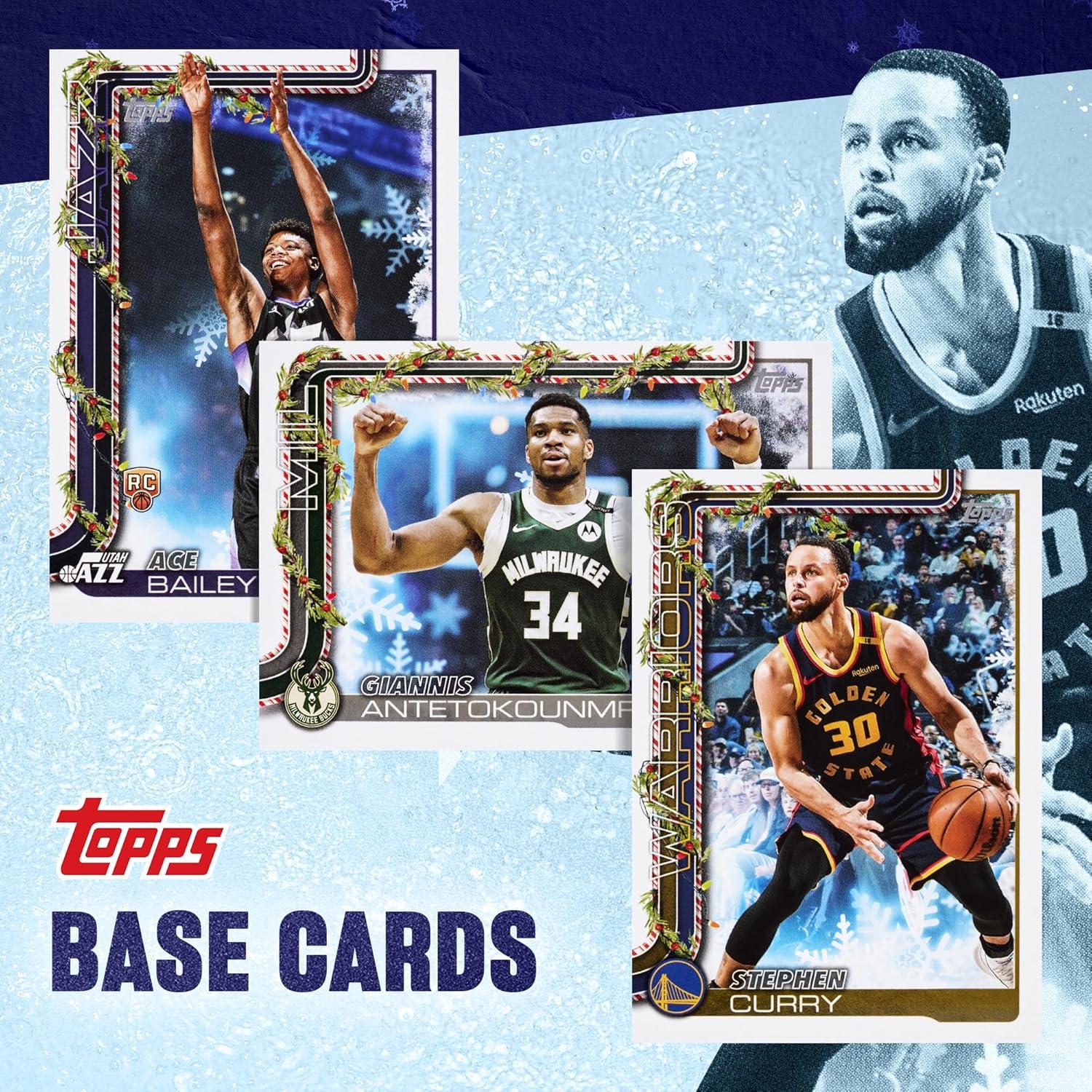 Holiday-Themed 200-Card Base Set: Build a 200-card base checklist featuring the NBA’s top rookies and veterans on festive designs. Collect stars like Jalen Brunson, Karl-Anthony Towns, and Paolo Banchero, plus rookies Ace Bailey, Kon Knueppel, and Dylan Harper. Teams such as the Miami Heat, New York Knicks, and Dallas Mavericks appear across this holiday-themed basketball card set made for every collector.