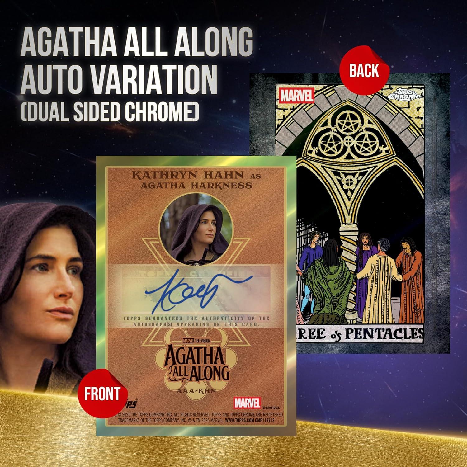 Key Cards That Define the Release: Looks for Marvel Cards such as Dual and Triple autographs pairing stars like Tom Holland/Benedict Cumberbatch, Zendaya/Brie Larson, and Mark Ruffalo/Simu Liu, Discover Agatha All Along autograph (Kathryn Hahn) and dual-sided Tarot variants; low-numbered “The Snap” parallels, inserts, artist sketch cards, and select redemption cards.